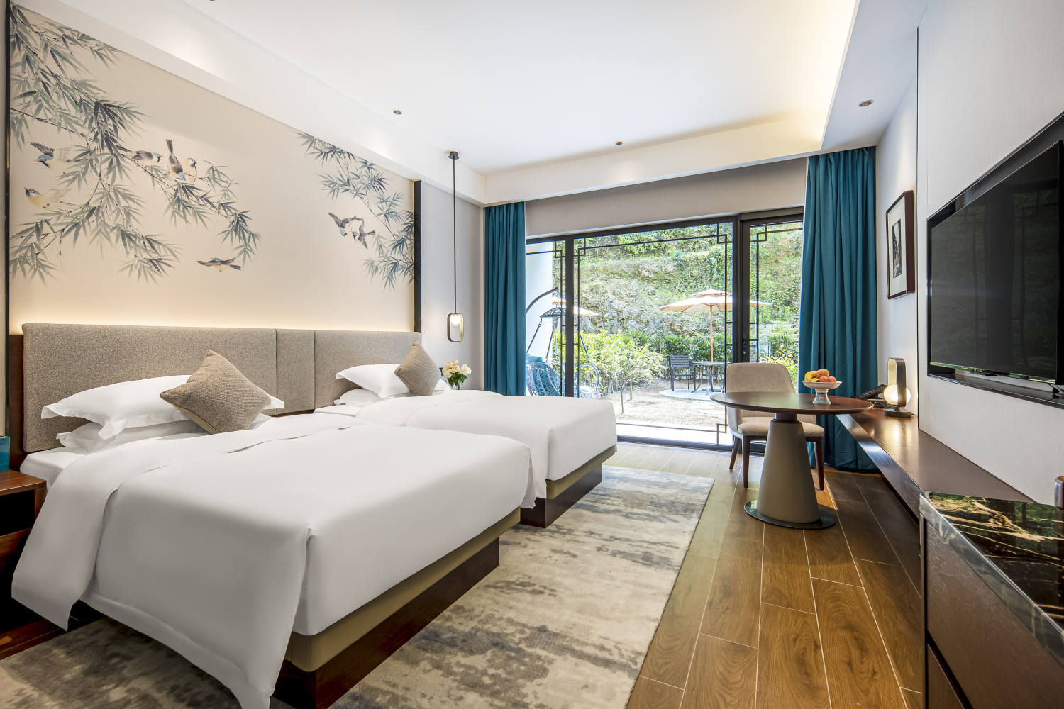 酒店位於安吉县西南、天目山北麓的长寿之乡——报福镇统里村,安吉天目山漂流、石马水库上游,沿统溪而建,落於潺潺溪流之畔,三面环山,天光云影,绿意盎然。环境宁静幽雅、空气清新宜人、景致四季如春。它汲取山水统里之灵气,将“山、竹、溪、居”融於一隅,绿水穿园中,清溪绕门前,万顷竹海相伴,心灵与环境融为一体。正是陶公千古名句:”采菊东篱下,悠然见南山,山气日夕佳,飞鸟相与还“的情景再现。